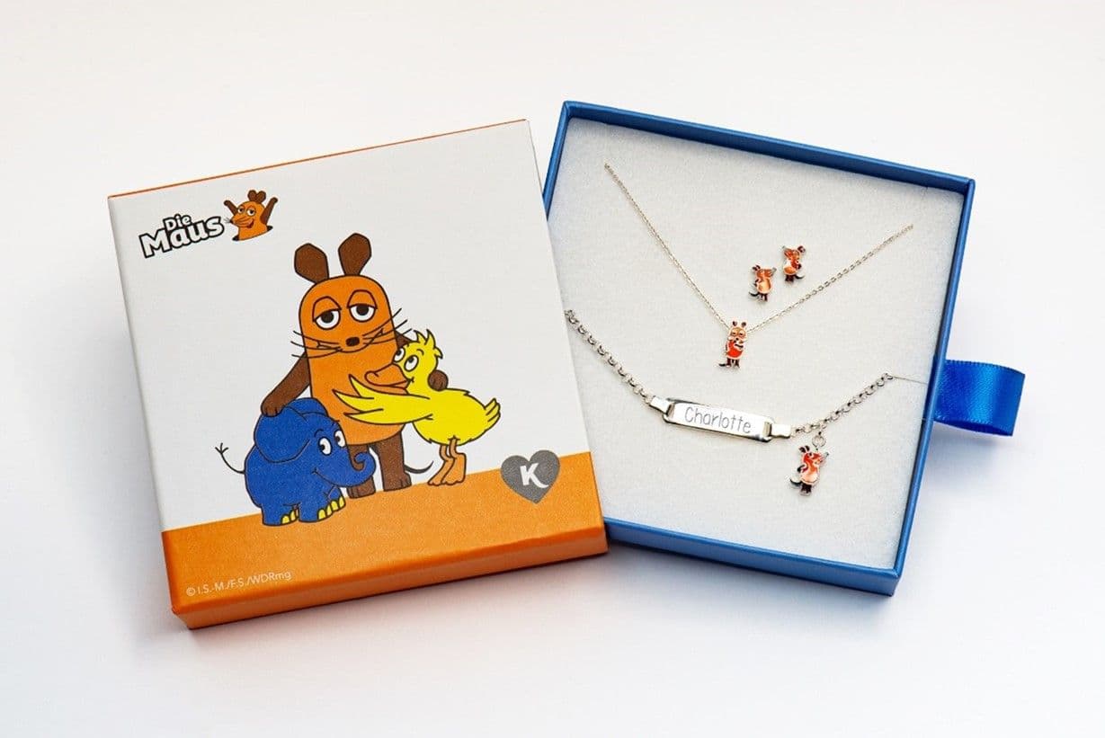 Juwelier Kraemer hat bei der Fertigung der Maus-Schmuckkollektion, die aus einem Collier, Armband und Ohrstecker besteht, besonders viel Wert auf die Details gelegt: Jedes Schmuckstück mit den Motiven der Maus und ihren Freunden ist aus 925er Silber gefertigt und von Hand coloriert. Somit ist jedes Schmuckstück ein Unikat: Die Maus, der blaue Elefant und die gelbe Ente sind sofort zu erkennen und gleichen den Originalen bis ins kleinste Detail. Kette, Ohrstecker und Armband sind einzeln oder im Set kombinierbar, das Armband kann zusätzlich personalisiert und graviert werden. Auch die Verpackung ist ebenso liebevoll wie originalgetreu gestaltet: Sie zeigt die drei Freunde in fester Umarmung und eignet sich als Geschenkverpackung oder als Schatzkästchen zur Aufbewahrung des Schmuckes.